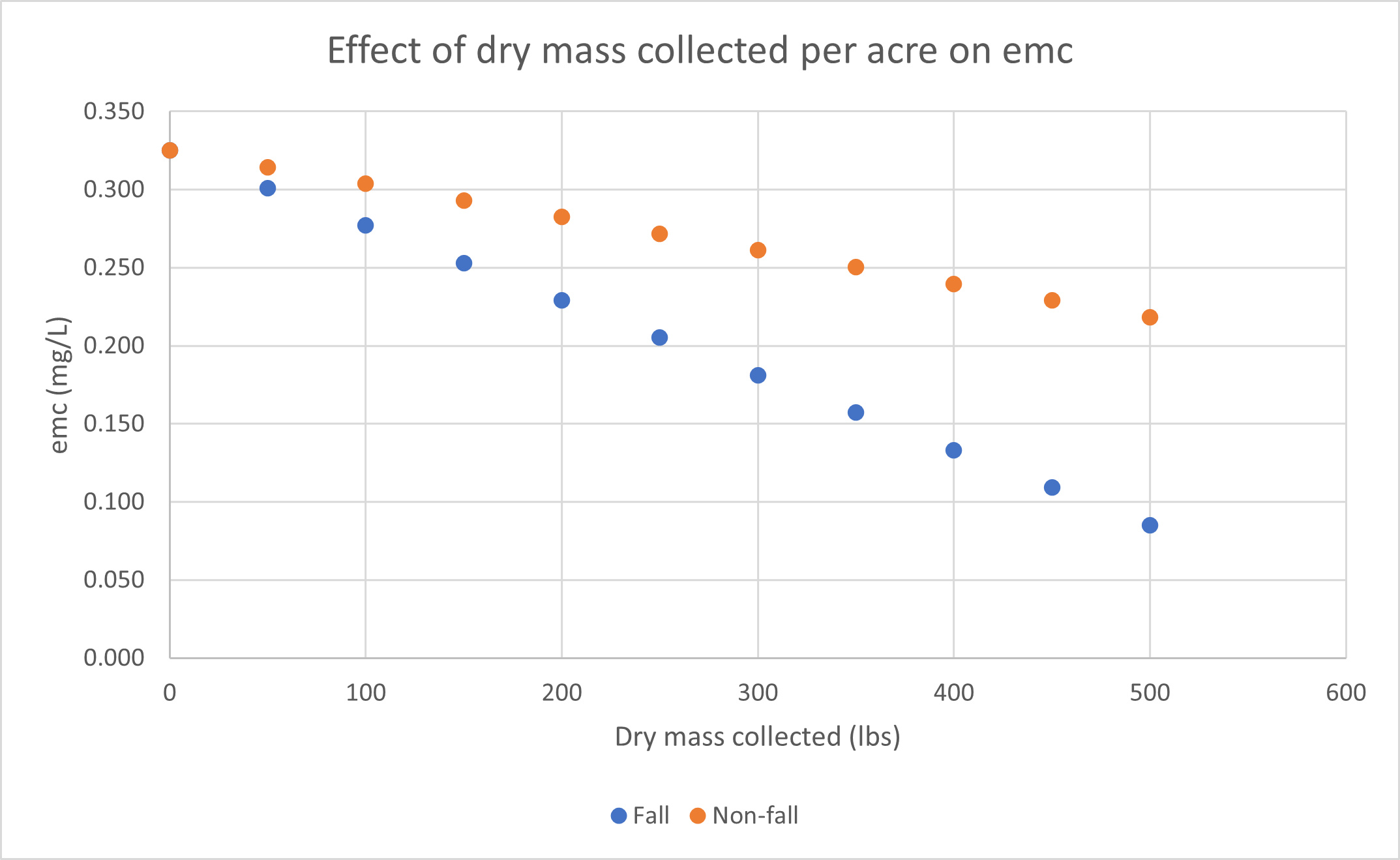 If a model is being used to track phosphorus loading, reductions in mass can be used to adjust the event mean concentration (emc). These adjustments assume a linear relationship between mass of P reduced and the emc.