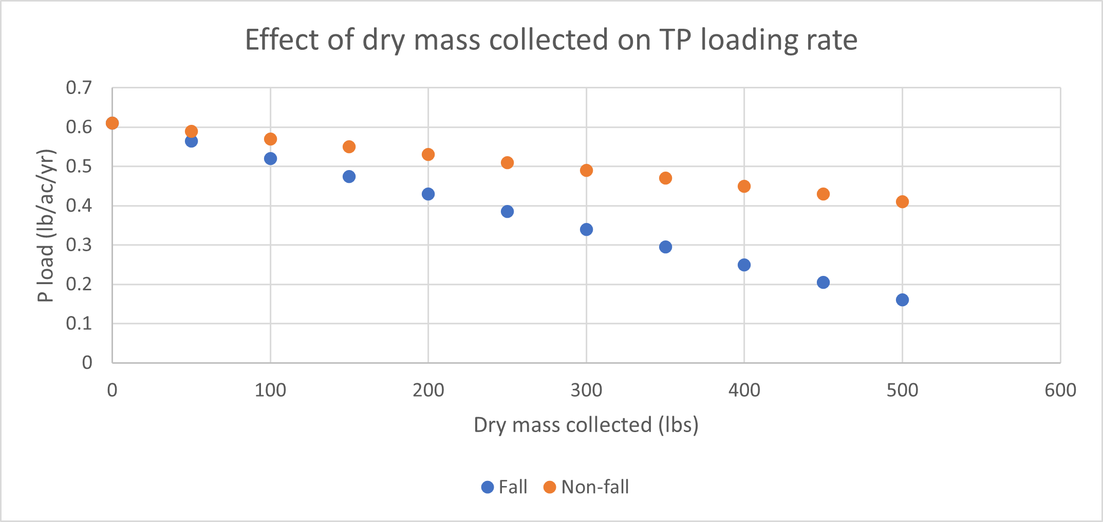 You can use this simple spreadsheet to calculate changes in annual loading (lb/ac/yr) and event mean concentration associated with collection of material via street sweeping: File:Accounting for P adjustments.xlsx