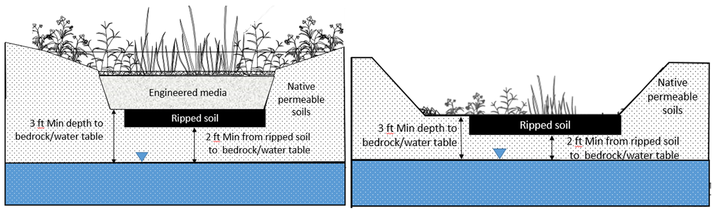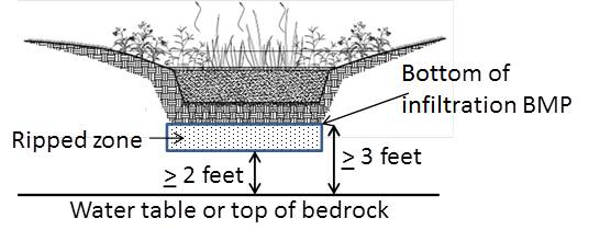 Warning: Maintain a 3-foot minimum separation distance between the bottom of the practice and the seasonally high water table or bedrock and a 1 foot minimum between the bottom of the subsoiled zone and the water table or top of bedrock.
