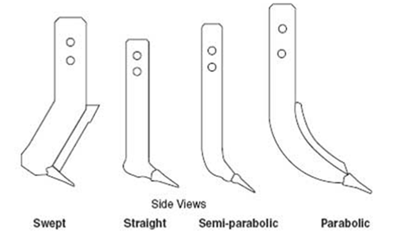 Subsoilers are available with a wide variety of shank designs. Shank design affects subsoiler performance, shank strength, surface and residue disturbance, effectiveness in fracturing soil, and the horsepower required to pull the subsoiler. According to Kees (2008), “Parabolic shanks require the least amount of horsepower to pull. In some forest applications, parabolic shanks may lift too many stumps and rocks, disturb surface materials, or expose excess subsoil. Swept shanks tend to push materials into the soil and sever them. They may help keep the subsoiler from plugging up, especially in brush, stumps, and slash. Straight or "L" shaped shanks have characteristics that fall somewhere between those of the parabolic and swept shanks.”