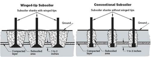 If subsoiling was effective, “The ground should be lifted slightly and remain relatively even behind the subsoiler, without major disruption of surface residues and plants. No more than a little subsoil and a few rocks should be pulled to the surface. If large furrows form behind the subsoiler, the shanks may not be deep enough, the angle on winged tips may be too aggressive, or the travel speed may be too high” (Kees 2008).