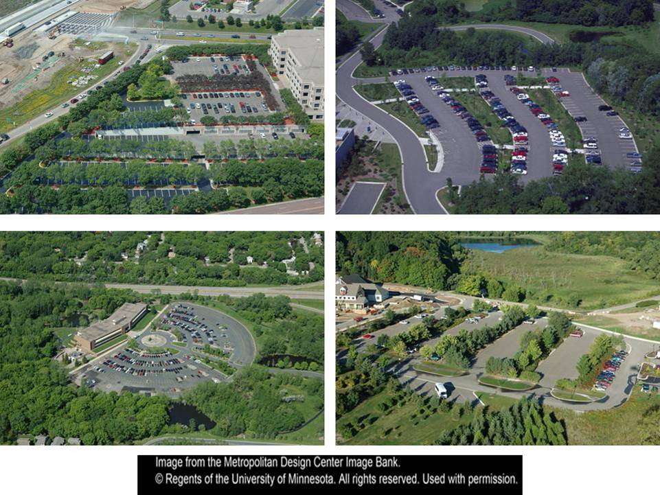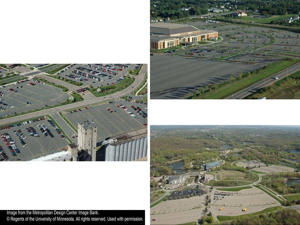 Excess parking lot stalls add a tremendous amount of impervious surface that is unnecessary for almost every day of the year except the day after Thanksgiving. This is just one of many situations where Minnesota stormwater managers can make a difference. The following figures provide examples for one of many land uses that substantially increase the amount of impervious area within a watershed. It provides some example alternatives that are possible to those who want to “think outside of the big box” and create resource oriented solutions.