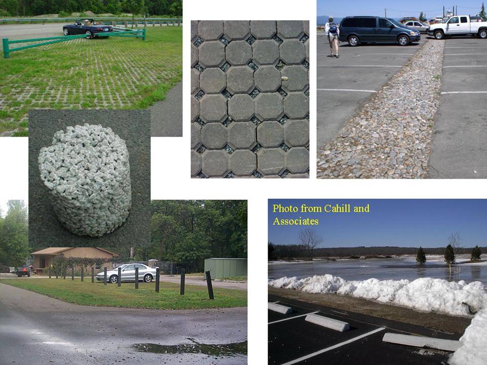 - Reduce the overall imperviousness associated with parking lots by providing compact car spaces, minimizing stall dimensions, incorporating efficient parking lanes, making use of vegetated parking islands, and using pervious materials in spillover parking areas where possible.