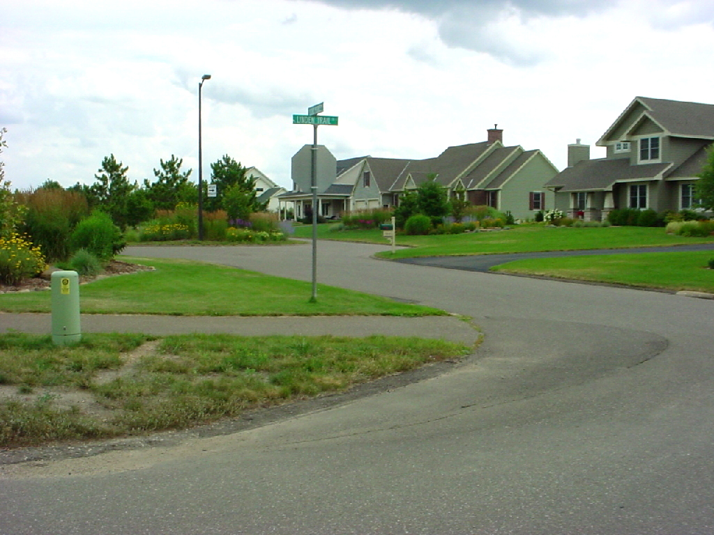 This residential conservation development uses minimum road widths and landscaped areas to reduce the amount of impervious surfaces and add to the rural character of the neighborhood. Vegetated channels and bioretention areas are used in the right-of-way to treat stormwater runoff.