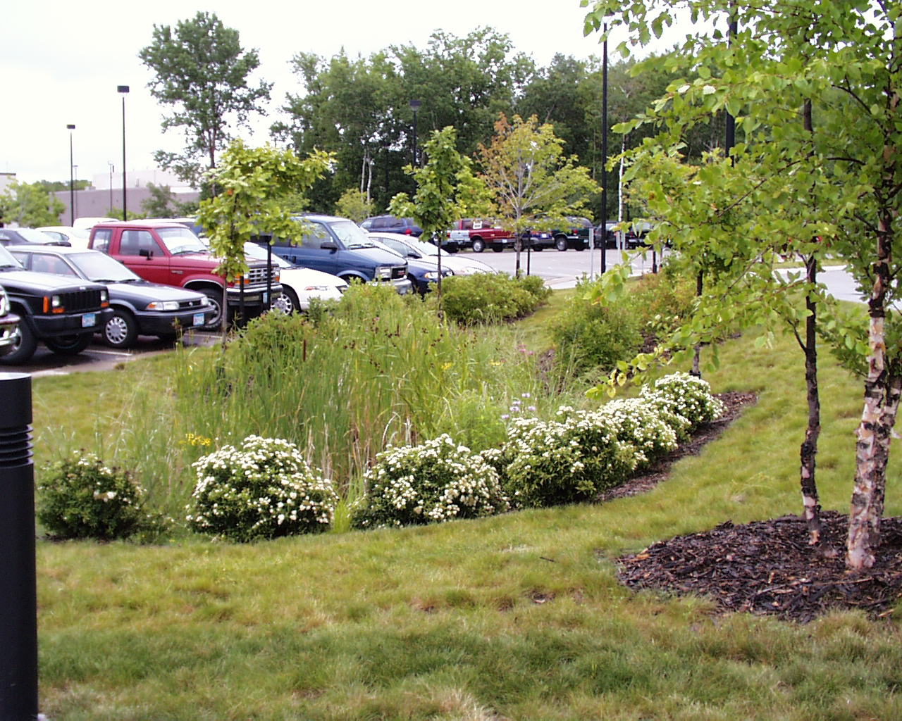 This parking lot incorporates bioretention strategies to treat stormwater runoff. The landscaped depressions provide stormwater treatment, snow storage, and improved parking lot aesthetics and climate. Low maintenance sedges are used in place of traditional turf grass to lower maintenance costs and pollution.