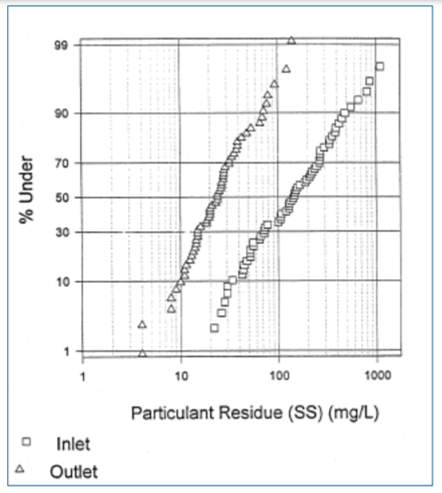 - Evaluate pollutant EMC reduction as a function of the observed pollutant concentration duration curve as outlined in the manual (USEPA, 2002). The adjacent figure (USEPA, 2002) shows the resulting plot from monitoring of influent and effluent TSS (i.e., particulate residue) concentrations. As can be seen, percent reduction is not constant and varies based on influent event loading to the pond.