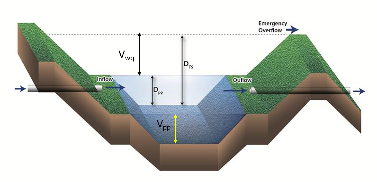 The Design Criteria for Stormwater Ponds contains guidance and requirements related to the sizing of pond permanent pool volume (Vpp) and live storage water quality volume (Vwq). The permanent pool (aka, “dead storage”) is the volume of water below the pond outlet, and the water quality volume (aka, “live storage”) is the storage volume between the pond outlet and the pond overflow elevation as shown in the adjacent figure. Narrative descriptions and resulting equations used to evaluate minimum volume required are outlined below.