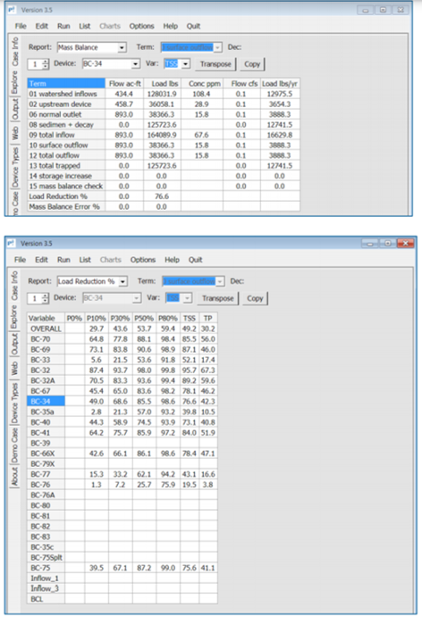 The adjacent figures show the hydrologic and hydraulic BMP input parameters required for one stormwater pond within the Battle Creek Lake major watershed model, as well as model results for the pond. These figures are included to summarize the detail of input requirements required for P8 modeling. Note: more-simplified, annualized models (e.g., MIDS Calculator, MPCA Simple Estimator) typically do not require this level of detail of inputs, but may not be capable of accurately modeling water quality loading and pollutant removal in BMPs for complex areas.