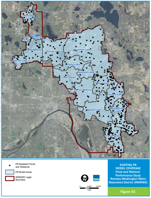 The Ramsey Washington Metro Watershed District (RWMWD) has developed water quality models spanning over 75 percent of the entire watershed district jurisdictional boundary. Modeling was performed using the P8 water quality model (Walker, 1990), and include all significant BMPs, including over 350 stormwater ponds. The models were originally created to evaluate pollutant loading to District managed lakes and waterbodies, but have been utilized for a wide variety of applications (e.g., used for development of area TMDLs, used to identify and prioritize areas for water quality BMP implementation, etc.).