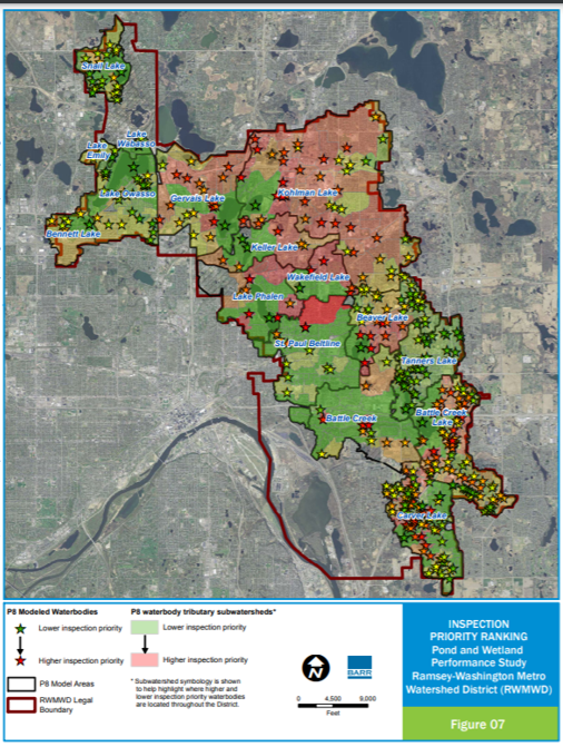 In 2016, RWMWD performed a study to evaluate the performance of stormwater pond and wetlands in all modeled portions of the District. A major goal of the Stormwater Pond and Wetland Performance Study (Barr, 2016) was to utilize P8 model results to help MS4s within the RWMWD prioritize stormwater pond inspection and assessment efforts. It is District policy that MS4s perform routine visual inspection of all municipal stormwater ponds at least once annually. Based on the large number of ponds within the District, municipalities were struggling to meet this goal. For this reason, the RWMWD, working in coordination with Barr Engineering Co. (Barr), developed a study to utilize District-wide P8 results to prioritize inspection efforts.