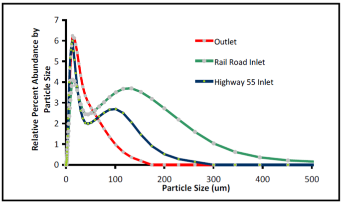 Another important monitoring finding was that particulate phosphorus (based on difference between total phosphorus and soluble phosphorus concentrations) accounts for the majority of total phosphorus loading to the pond. Collected particle settling data shows that particles entering the pond are large and settleable. Particles currently being removed by the pond are greater than 150 µm in diameter, hence, any additional performance improvements will need to be achieved by removing smaller particles (i.e., particles less than 150 µm in diameter). Because most of the phosphorus is bound to particles (particulate phosphorus = total phosphorus – total dissolved phosphorus), improved phosphorus removal could result from improved particle settling conditions in the pond.