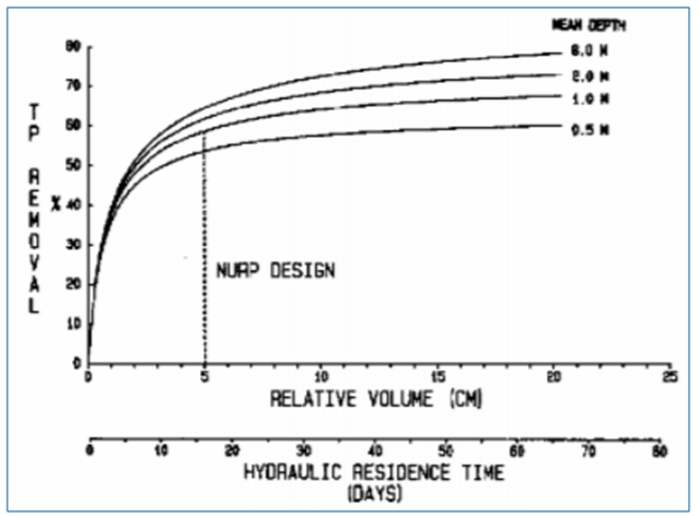 Although all four water quality models evaluated above produce estimates of TSS removal, none are capable of evaluating bathymetric volume loss to sedimentation in real-time. In all of these models, bathymetric volume remains a static value throughout the duration of the model run. For a majority of pond systems, this modeling limitation does not have a significant impact on model results. The adjacent figure, adapted from Phosphorus Removal by Urban Runoff Detention Basins (Walker, 1987) shows stormwater pond total phosphorus reduction as a function of “relative volume” (i.e., pond volume / (watershed area) X (runoff coefficient)) and mean pond depth. Beyond typical design standards (i.e., National Urban Runoff Program (NURP) standards), the mean depth has relatively minor impact on percent reduction over a wide range of mean pond depth values (i.e., 0.5 – 8.0 meters). For example, for a NURP design pond, a decrease in mean depth from 2.0 meters to 1.0 meters results in a reduction in TP removal efficiency from 60% to 55%.