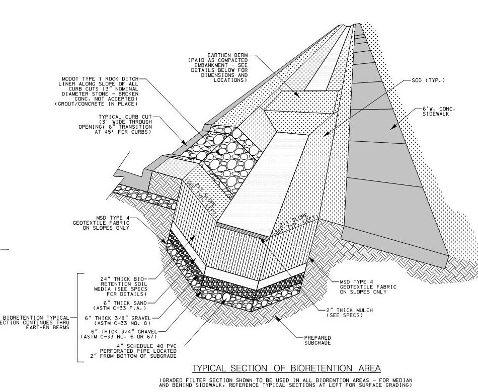 Design general performance criteria for stormwater management for this project was based on Metropolitan St. Louis Sewer District (MSD) Section 4.080. Stormwater management was required because the redevelopment area exceeded 1 acre of disturbed area.