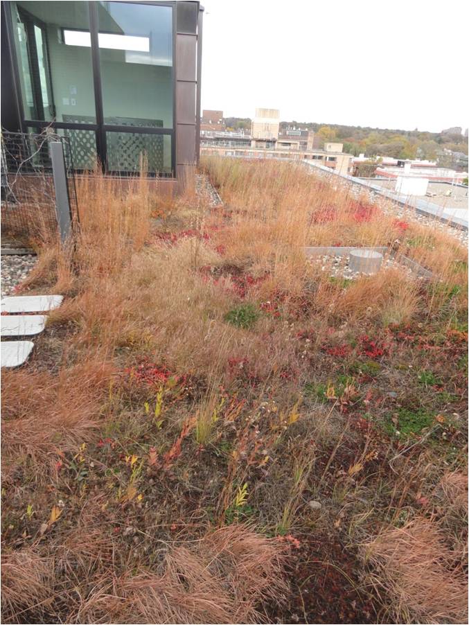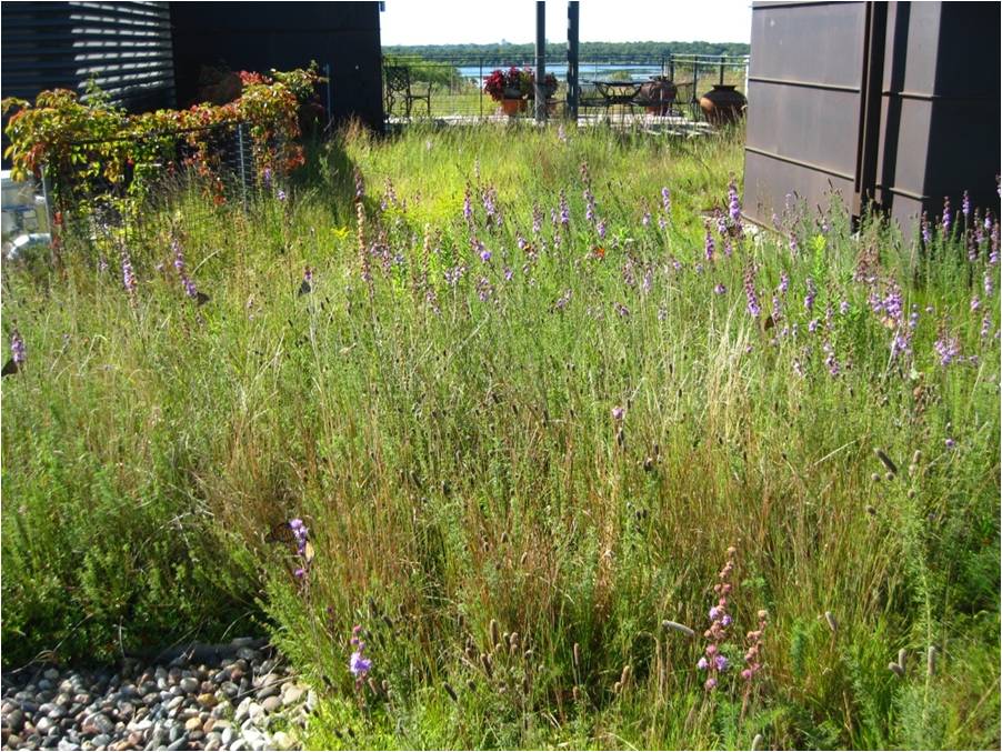 Plant list: 18 sedum species, which are traditionally used on European green roofs, were combined with 41 grasses and forbs that are native to Minnesota’s bluff prairies, a habitat template similar, in many ways, to conditions found on extensive green roofs.