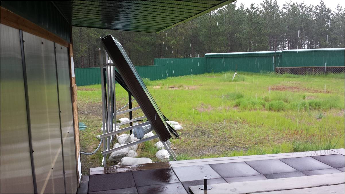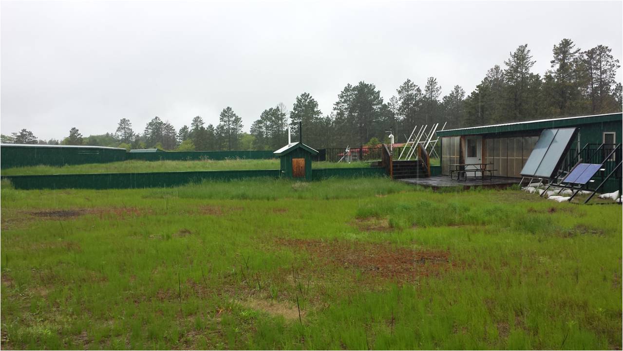 Twelve planted bins were installed on the green roof to test evaporation rate and water holding capacity of a zero discharge green roof (i.e. without a drainage layer). Species selected for the bins are able to tolerate both droughty and flooded conditions, and can evapotranspire high volumes of water when water is available. Half the bins were planted with Prairie Cord Grass, and the other half with Canada Goldenrod. Half of each species was in bins with a traditional green roof soil, and the other half in a growing medium made of shredded recycled polystyrene modified to improve water holding capacity and cation exchange capacity, mixed with clay and compost.