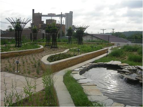Green Infrastructure: Green roofs consist of a series of layers that create an environment suitable for plant growth without damaging the underlying roof system. Green roofs create green space for public benefit, energy efficiency, and stormwater retention/ detention.