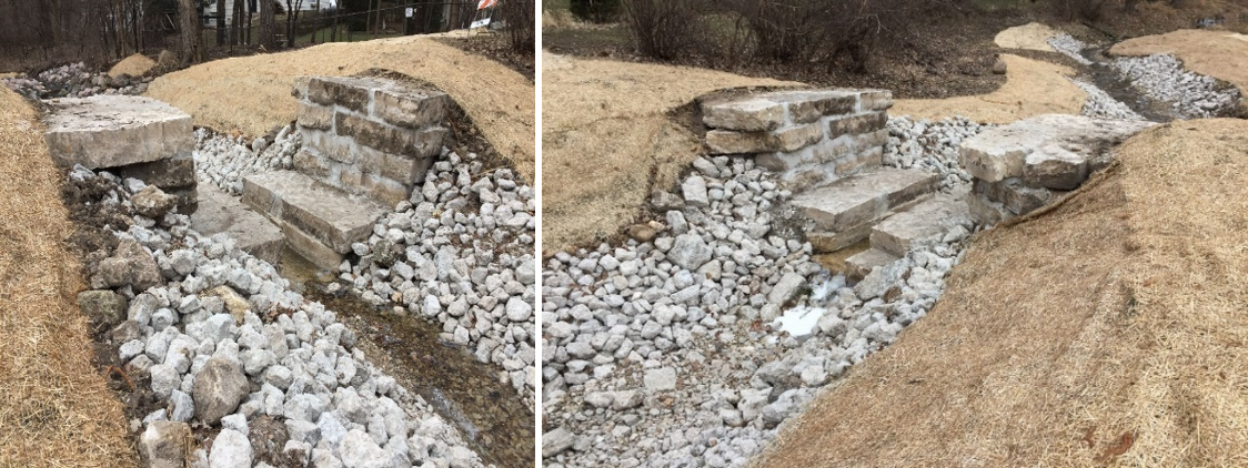 Each element of the project followed local regulatory requirements during the analysis and design of the resulting system. A major design consideration was detention of flows above the step-pool system to regulate flows. A grouted limestone weir structure was designed to control the flow of water to ensure step-pool stability. This two-stage weir allows normal flow conditions to pass directly to the step-pool swale while the 2-year event flows pass through the second stage. The weir is designed to route flows up to the 10-year event. The weir system was designed using XPSWMM. The resulting upstream detention area holds 0.18-acre feet of water during the 10-year storm. Flows leaving the weir were then considered when designing the step-pool swale.