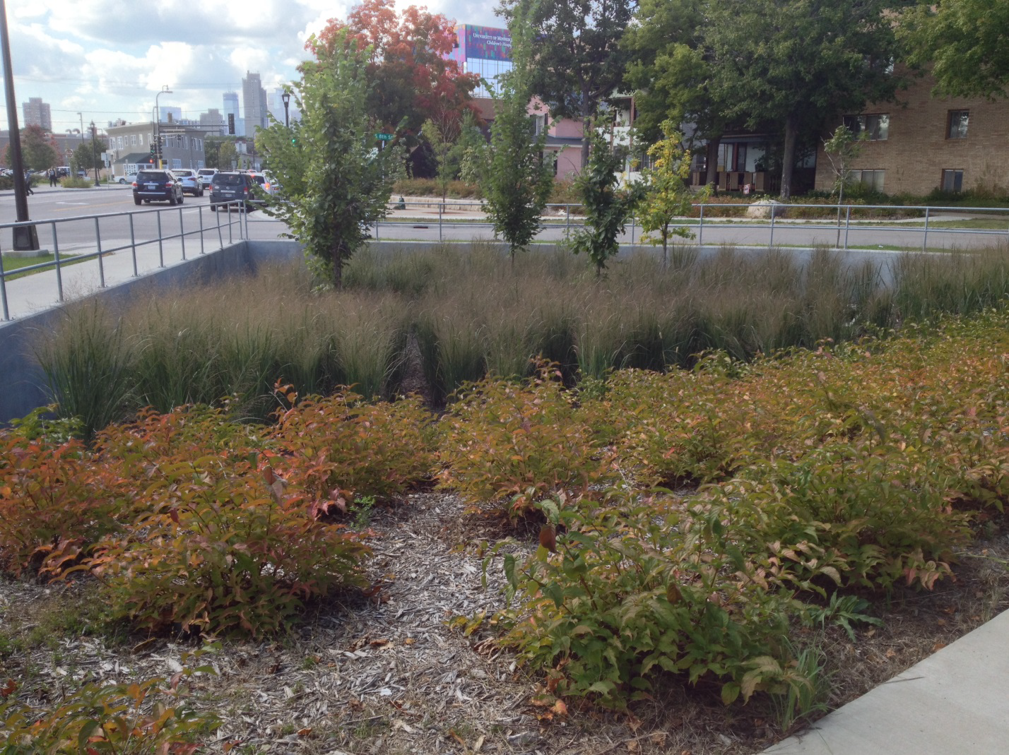 The City of Minneapolis hired Barr Engineering to design stormwater best management practice (BMPs) along Riverside Avenue in conjunction with a street reconstruction project, which added bike lanes, parking, designated turn lanes, and center medians. Design and construction took place between 2011 and 2013.