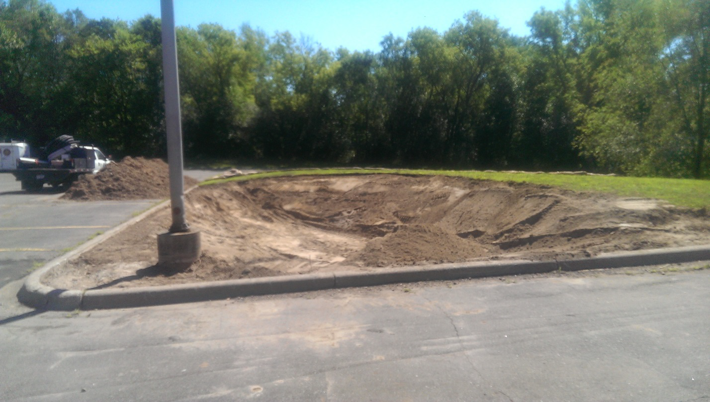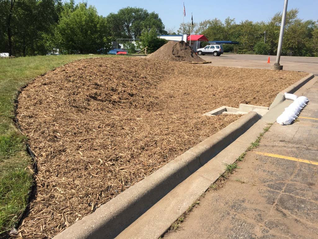 For preconstruction investigations, an 18 foot soil boring was used to identify sandy gravel soils. There was no confining layer of less permeable subsoils identified. The basin was sized to collect the 1.1 inch storm event off the parking lot and surrounding sidewalks. The basin was graded to store water no deeper than 12 inches below the gutter flow line. The curb cut was positioned at the lowest possible downstream side of the curb. Surrounding slopes within the basin were designed to be no greater than 4:1.