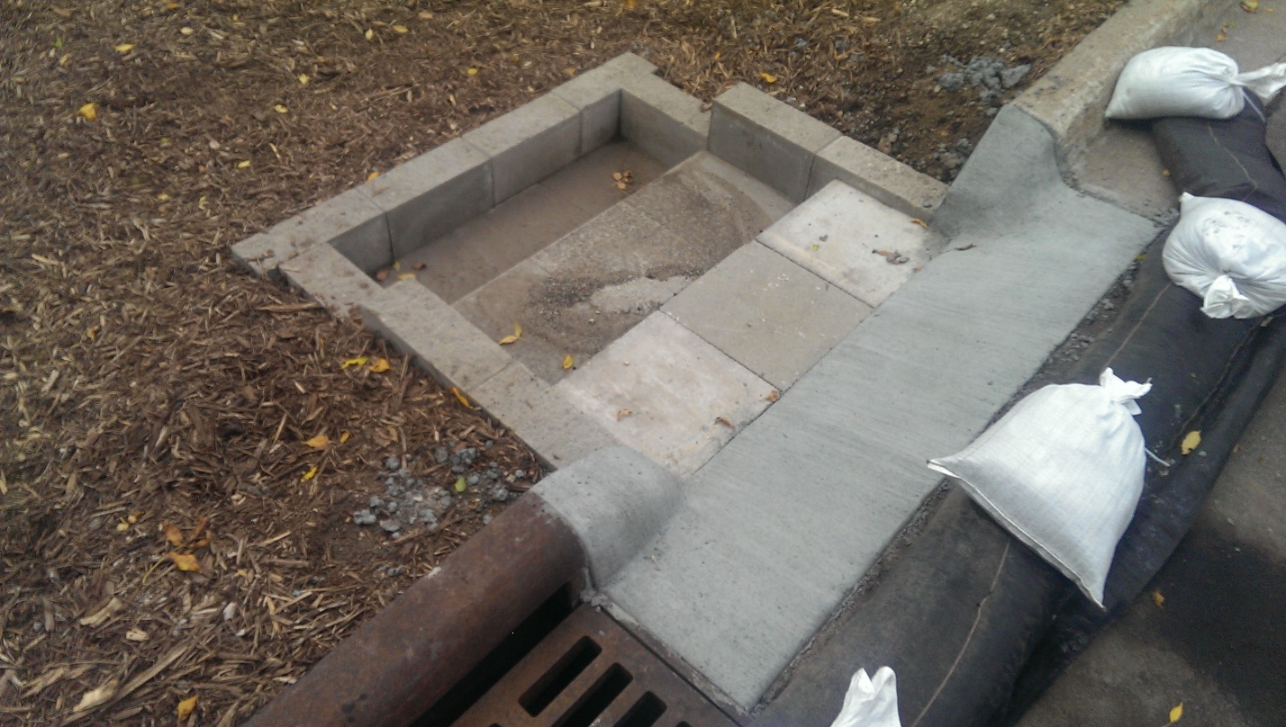 Pretreatment for the infiltration basin is provided by a curb cut with a modular block step-down structure. Stormwater flows down the block steps and into a shallow sump feature akin to a small forebay. The energy of the stormwater is dissipated to prevent scouring or erosion while sediments are allowed to drop out for easy collection later. The pretreatment sump is not sized per current Stormwater Manual recommendations that the forebay be approximately 10 percent the size of the infiltration basin.