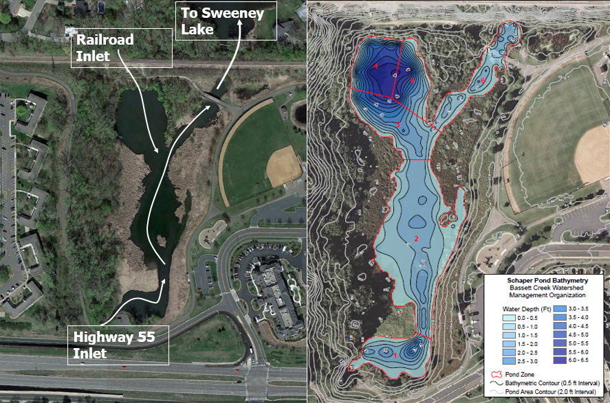 Since approximately 90 percent of the phosphorus load to the pond came from the Highway 55 inlet, but only 35 percent of the pond volume is provided to settle phosphorus from this source, diversion of influent water to the north west lobe of the pond was identified as a way to provide additional phosphorus settling time and improve overall phosphorus removal performance in the pond. This improvement option was implemented and is currently being monitored by the Bassett Creek Watershed Management Commission for treatment performance.