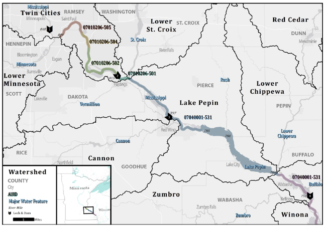 The South Metro Mississippi River TSS TMDL report (MPCA, 2015) was approved in 2016 to address aquatic life impairment related to excess turbidity (TSS). The report established TSS TMDLs for five stream reaches in the South Metro – Mississippi River (South Metro) watershed, extending from River Mile 844 (the confluence with the Minnesota River), to River Mile 780 (downstream of the confluence with the Rush River, Wisconsin) as shown in the adjoining figure. All known sources of TSS loading were considered in the development of the TMDL and general implementation strategy. These sources include