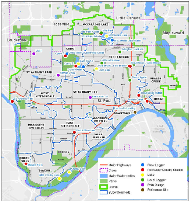 One method of evaluating compliance with the categorical TSS areal loading rate WLA established in the TMDL (i.e., 154 lbs/acre/year) is to monitor major outfalls that discharge to the Mississippi River within the South Metro watershed. An example of how outlet monitoring can be used to evaluate compliance with an areal loading rate WLA is provided in the CRWD 2015 Stormwater Monitoring Report (CRWD, 2015). The CRWD 2015 Stormwater Monitoring Report (CRWD, 2015) provides a detailed description of monitoring operations (e.g., period of operation, operation of automated ISCO samplers, area-velocity sensors used to monitor flow, etc.), sampling and laboratory analysis (e.g., delivery of sample for laboratory analysis, QAQC procedures, etc.) and total discharge and pollutant load calculations (e.g., baseflow partitioning analysis, calculation of event load and baseload, flow-weighted average concentration calculations, and pollutant yield (lbs/acre), etc.). Additionally, the document provides a detailed summary of outfall monitoring efforts conducted throughout 2015. Full water quality stations (i.e., automated sampling stations collecting flow and water quality data) were installed at ten (10) locations listed below and are shown in the adjoining figure.