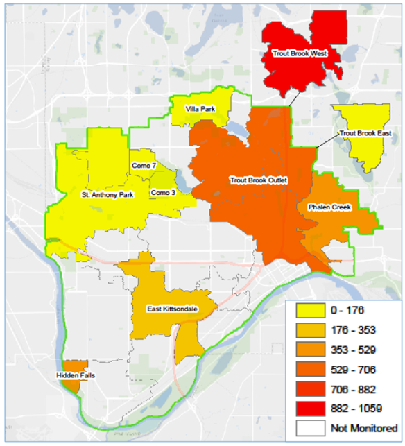 Using 2015 monitoring data collected at the ten (10) full water quality monitoring stations and flow and loading calculation procedures outlined in the report (CRWD, 2015), CRWD developed summary pollutant loading tables for the watershed district, including the TSS areal loading (lbs/acre/year) calculated at each station (see Table 5.1, of the CRWD 2015 Stormwater Monitoring Report; CRWD, 2015). The adjoining table summarizes data collected at the ten (10) full water quality monitoring stations presented in the monitoring report. Five (5) of the 10 full water quality monitoring stations are meeting the categorical TSS areal loading rate WLA established in the South Metro Mississippi River TSS TMDL report (MPCA, 2015) (i.e., 154 lbs/acre/year). The adjoining figure provides a spatial summary of monitored TSS areal loading rate throughout the CRWD. Results presented are a valuable watershed management tool and can be used to identify and prioritize individual watersheds and drainage areas for BMP implementation.