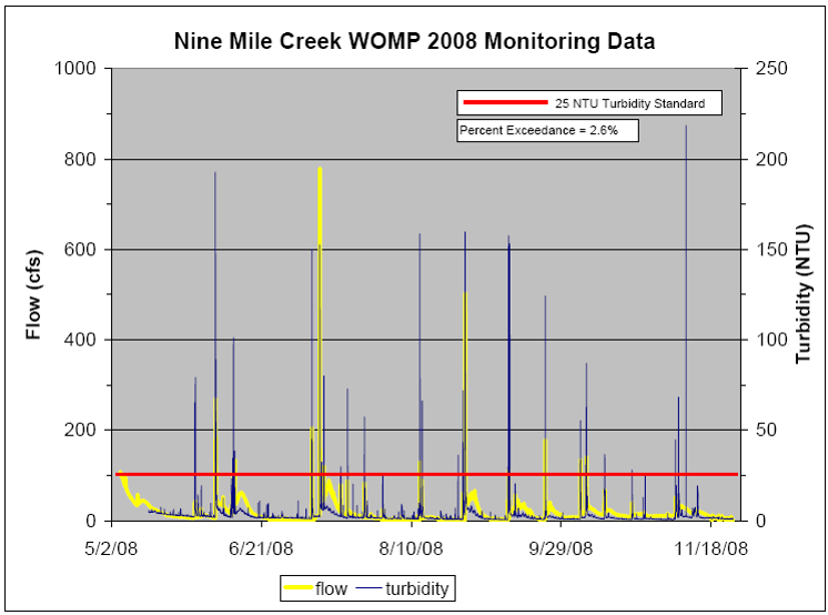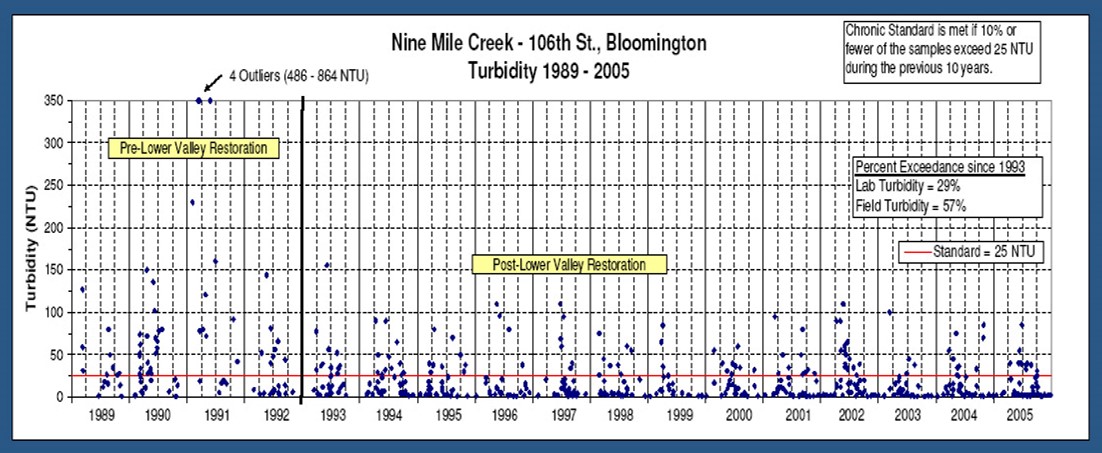 Following the 2005 monitoring season, an evaluation of the turbidity data (see adjoining figure) indicated that Nine Mile Creek turbidity levels had dropped significantly since the Lower Valley Restoration Project implementation during the winter of 1992/1993.