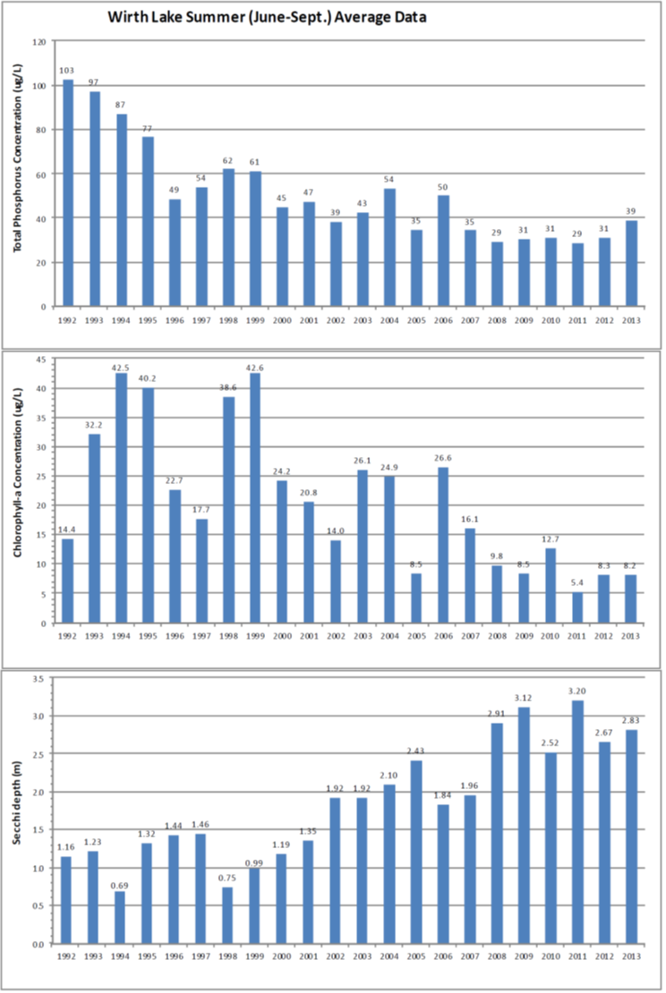 Water quality summary (1992-2013) for Wirth Lake: TP (top), chl-a (middle), Secchi disk (bottom)