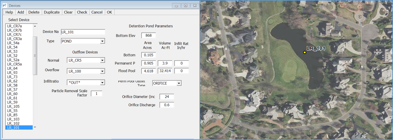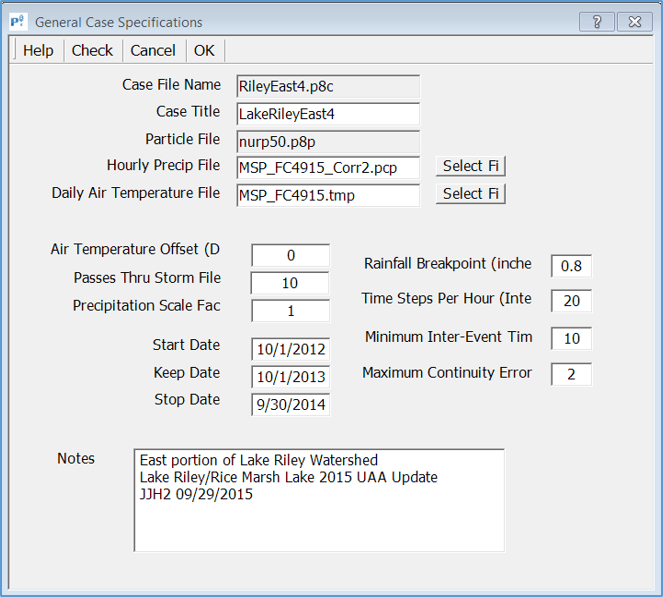 a. Develop (or review) existing BMP inputs and model for the TMDL modeling period. In the case of the Lake Riley TP TMDL, Eden Prairie may choose to request the P8 model used to develop the TMDL. After receiving the TMDL P8 model, the City should (a) compare modeled BMPs included in the TMDL P8 model to the existing BMP inventory (step 4), (b) review and confirm model input parameters for modeled BMPs are correct and (c) generate model inputs for BMPs not included in the received model using model input guidance. An example of model inputs for wet pond LR_101 are shown in the figure to the right. After reviewing, updating, and creating all required existing BMP inputs, the job control must be updated to match the TMDL modeling period (i.e., the 2014 water year for the Lake Riley TP TMDL, see job control parameters in figure to the right). If starting from an existing TMDL P8 model, updates/edits to job control parameters (rainfall and temperature input files, start/stop date, passes through the storm file, etc.) should be avoided. If creating a new model, guidance should be used to develop model BMP and job control inputs.