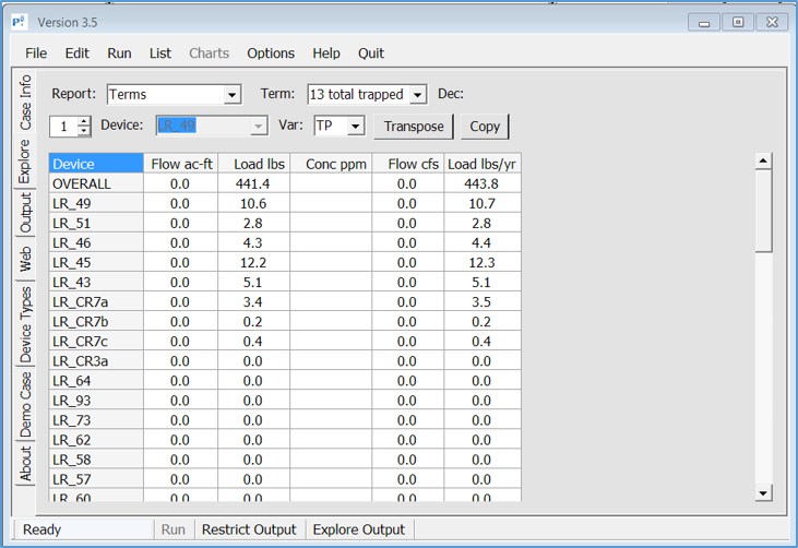 b. Determine existing load reduction and compare to WLA. After reviewing and generating P8 model inputs, the P8 model can be run for the TMDL modeling period to determine the existing load reduction. In the case of the Lake Riley TP TMDL, the originally received P8 model which was used to develop the TMDL should be retained so that reduction values can be compared to the original TMDL P8 model. Reductions in TP loading to Lake Riley greater than original TMDL P8 model represent progress towards the target WLA load reduction (e.g., 13 lbs TP per year). An example of total sedimentation and filtration removal results l (i.e., total trapped; see here) from the TMDL P8 model is shown in the figure below.
