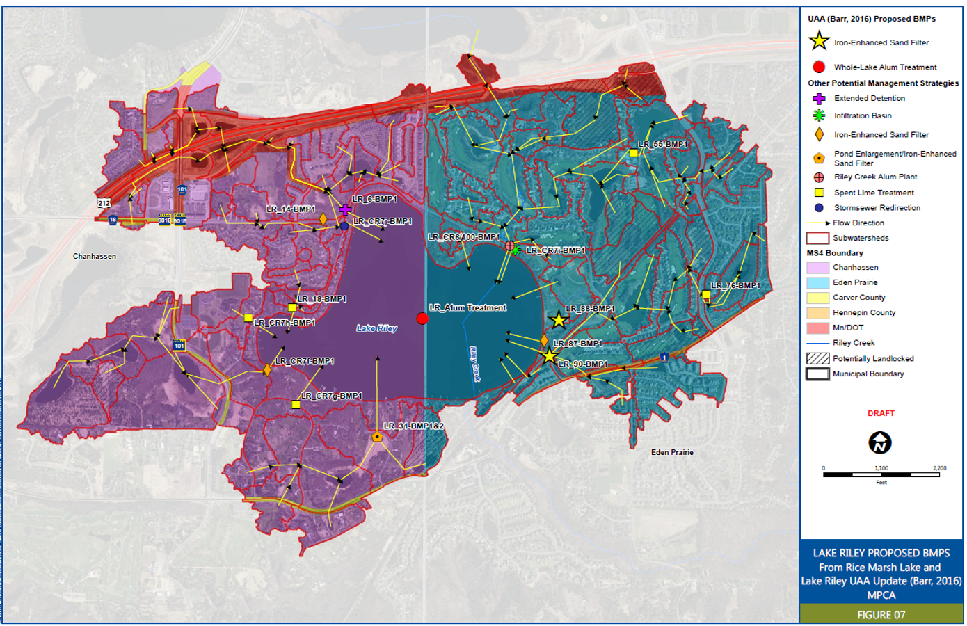 6. Review the TMDL implementation plan, Watershed Restoration and Protection Strategies report, Use Attainability Analysis (UAA) report, subwatershed assessment reports, or other relevant watershed planning documents (if applicable). The Lower Minnesota River Watershed TMDLs: Part II – Northern Watersheds: Riley-Purgatory-Bluff Creek and Nine Mile Creek Watersheds (MPCA, 2020) contains an “implementation strategies” section which provides a high-level overview of structural and non-structural BMPs which can be reviewed and implemented to achieve WLA compliance, but does not provide guidance for specific TMDLs (e.g., the Lake Riley TP TMDL) or specific MS4s (e.g., Eden Prairie). However, the TMDL does reference model development and review of implementation strategies developed in the Rice Marsh Lake and Lake Riley: Use Attainability Analysis (UAA) (Barr, 2016; see table 16 in Barr report). The UAA provides a review of lake water quality, existing BMPs, and proposed BMPs that can be implemented to attain compliance with the Lake Riley TP WLA, including a detailed cost-benefit analysis (discussed further in item #7).