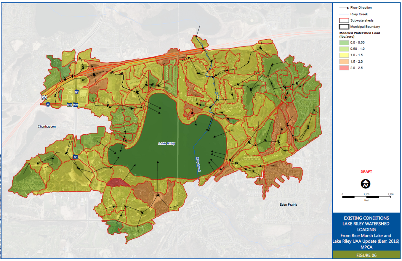 If the TMDL does not include an implementation plan or does not develop specific recommendations related to BMP implementation, results for the existing conditions WinSLAMM can be used to target areas for BMP implementation. One method of identifying and targeting areas of high pollutant loading within the modeled watershed for BMP implementation is to calculate the “watershed pollutant areal loading (pre-treatment) (lbs/acre/year)” and “outflow pollutant areal loading (post-treatment) (lbs/acre/year)” as outlined in this table. Joining these results to modeled subcatchment areas allows the user to visualize “hot spots” of pollutant loading generated from the watershed without controls (pre-treatment) and leaving the modeled BMP with controls (post-treatment). An example showing watershed pollutant areal loading for the existing conditions for a different TMDL and lake area, the Lake Riley RP TMDL, is shown here. As can be seen, watershed pollutant loading is correlated to land use, with more-developed portions of the watershed generating more TP loading than less-developed areas.