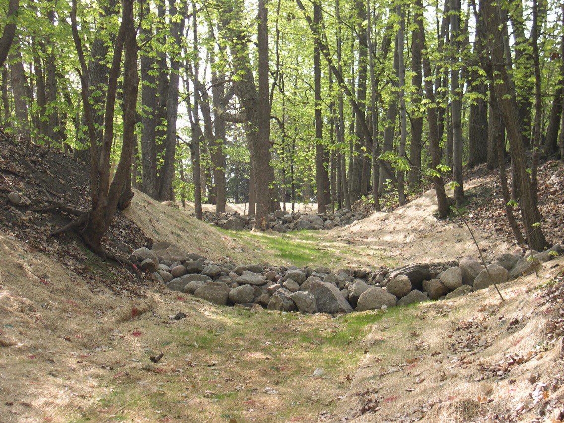 - If significant erosion occurs between dams, install a protective turf reinforcement mat or section of rip rap liner in that portion of the channel.