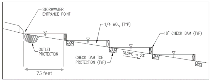 The number of check dams should be computed based on swale slope, length, and treatment objectives. For example, a swale designed to contain the entire Vwq may require more check dams than a swale that only contains a portion of the Vwq.