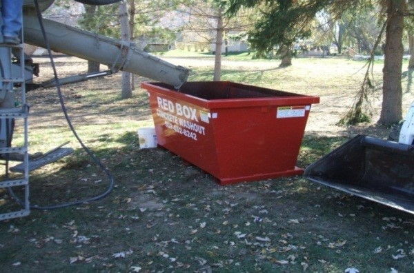 Services are also available for hire that deliver a prefabricated washout container to collect concrete chute rinse water as well as wash water from tools and equipment generated on-site. Some services provide the containers alone without providing maintenance and disposal of materials, while other companies offer complete service that includes delivery of containers and regular pickups of solid and liquid waste materials. If these options are not available, the site owner and contractor can install a washout containment facility. A leak-proof container can be purchased or constructed onsite using an impermeable plastic or vinyl liner. The operators at the site will need to ensure no rips or tears develop in the liners or the liner will need to be replaced.