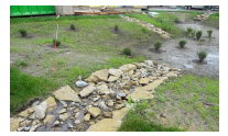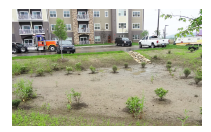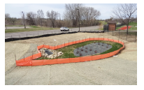 | Months later, the construction project is complete. The basin captures rainfall from a small rain event but it doesn’t infiltrate. Costly repairs are required in order for it to function properly. | This photo shows a system that has been properly protected after construction. Contributing drainage areas have been stabilized and the basin has been protected with the orange silt fence from both sedimentation and compaction from vehicle traffic. | ||