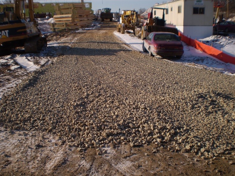 Vehicles leaving a construction site during the winter months can track sediment and sediment-laden snow from the site onto adjacent roadways. It is important to remember that all construction sites must remain in compliance with the NPDES/SDS permit throughout the winter even if no construction is occurring; therefore a well maintained and functioning vehicle tracking pad must be in place. Regular inspection of vehicle tracking pads must continue throughout the winter months and regular maintenance will be needed during the spring thaw. As with the summer months, additional aggregate should be readily available for top dressing and maintenance of the pad throughout winter.