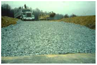 A vehicle tracking pad is typically a stabilized pad of aggregate over a geotextile base installed at every vehicle exit utilized by construction traffic. It is designed in a way that when vehicles drive over the pad, the tires sink into the rock slightly and mud is removed. Generally the aggregate used is 1.5 to 3 inches in size and placed in a layer approximately 6 inches thick. However, the MPCA staff has observed that vehicle tracking pads consisting of coarser aggregate materials (2 to 6 inches) are often more effective in many applications. The vehicle tracking pad should be at least 50 ft long but longer pads may be required to adequately clean tires. The amount of construction traffic and frequency of use should be considered when designing a vehicle tracking pad.