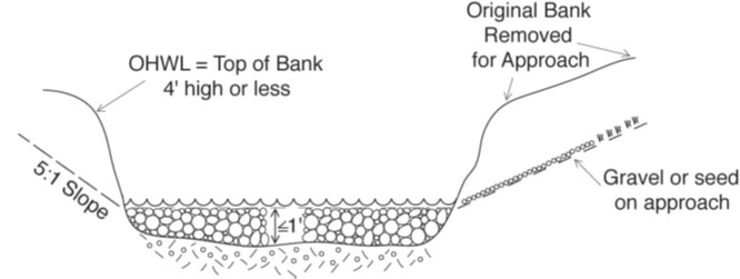 - Approaches to the ford should be constructed out of stone pads, underlain by a geotextile fabric, and protected with a sufficient layer of aggregate (typically about 4 inch diameter). Do NOT place rock in the channel; only on approach ramps.