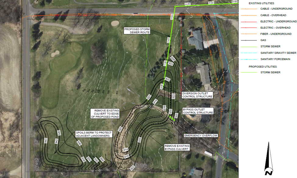Overflows from the proposed stormwater storage pond would discharge to an existing stormwater culvert and ditch system through a neighborhood, and ultimately discharge to Shields Lake. Preliminary calculations from the pre-feasibility design phase determined that the proposed harvest and use system would supply up to 26 million gallons of water per year for irrigation and reduce 77 pounds of phosphorus (including dissolved phosphorus) per year from the drainage area to the harvest and use system.
