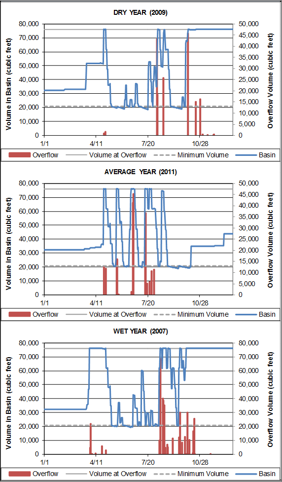 In the design of the storage unit, it is also important to utilize a daily time-step model that generates outputs on a daily time-step to account for other design considerations, such as limiting overflow events or minimizing pond surface level changes. For example, the figure to the right illustrates the water level changes in the same stormwater harvest and use system over a characteristic dry (2009), average (2007), and wet (2011) year. In the dry year, the basin level (blue line) is at the minimum water level (dashed grey line) for most of the growing season with several overflow events (red bars) later in the growing season. In the average year, the basin water level fluctuates more and has more overflow events during the growing season, but no overflow in the fall. In the wet year, the basin water level is again at the minimum water level for some of the growing season with many overflow events after the growing season. By analyzing the water level trends in these graphs, the following conclusions could be drawn. If minimizing overflow events is a design constraint, the storage basin volume could be increased. If minimizing the amount of time the basin water level is at the minimum water level (for aesthetics), the amount of harvested water distributed to indoor or outdoor uses could be decreased.