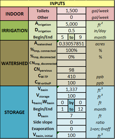Three main inputs were altered in the Stormwater Reuse Calculator for this site: