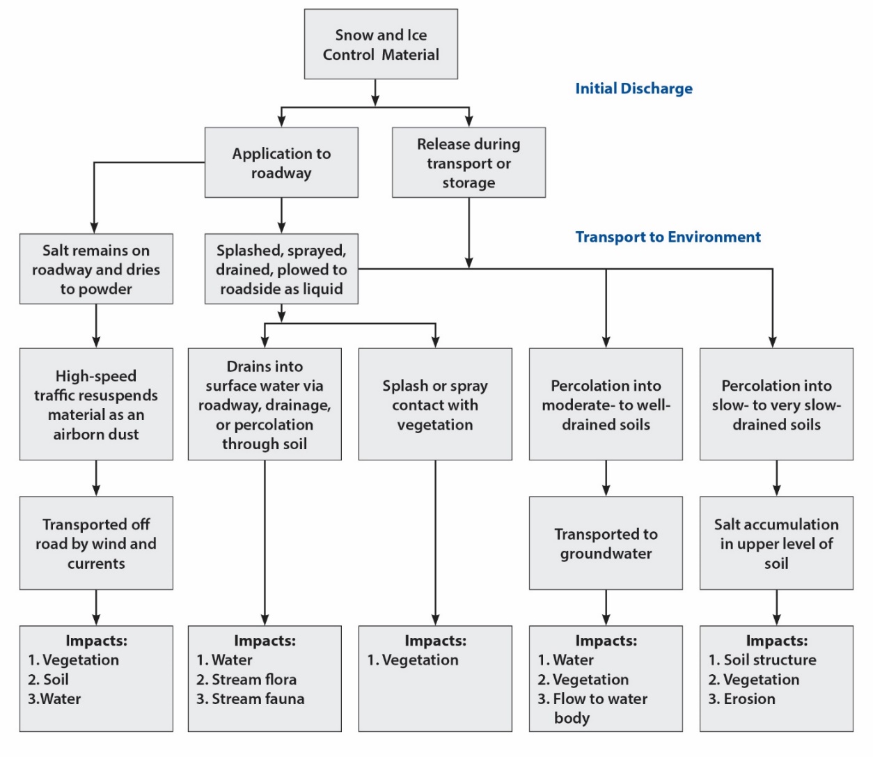 The chloride-based deicers discussed in this section are sodium chloride (NaCl), magnesium chloride (MgCl2), and calcium chloride (CaCl2). Deicers can enter into the environment during storage, transport, and application. The distribution of the deicer is a complex process, an overview of which is provided in the figure to the right. When chloride deicers are dissolved in runoff, the anion and cation dissociate. The following section separately describes the environmental effects of anions (i.e. chloride) and cations (i.e. sodium, calcium, or magnesium).