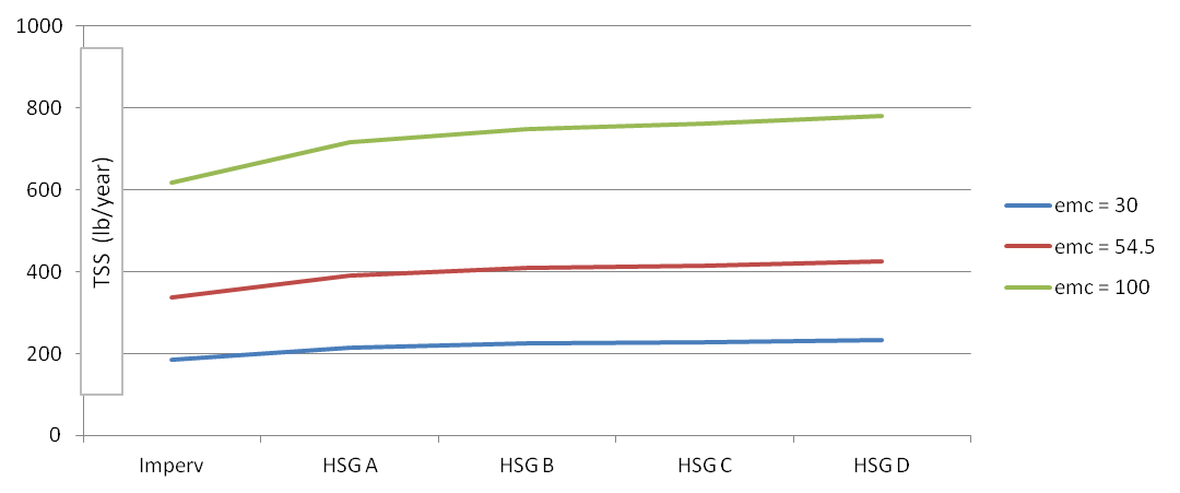 To assess the effect of changing the TSS emc, we ran several scenarios using the Minimal Impact Design Standards Calculator. For each model run we assumed 31.9 inches of precipitation annually. We varied the emc as follows