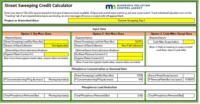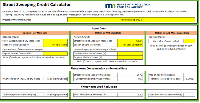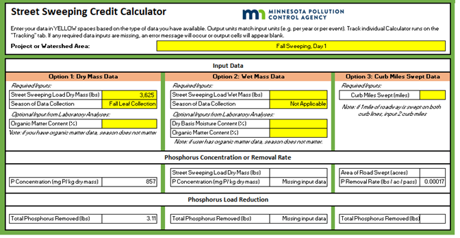 Using the MPCA Street Sweeping tool, Option 1, enter 3,625 pounds of dry mass and select the appropriate season. In this example the season is fall leaf collection because sweeping occurred in October. The tool will calculate the TP removed based on the default TP concentration and return the TP removed. In this example TP removed = 3.11 pounds.