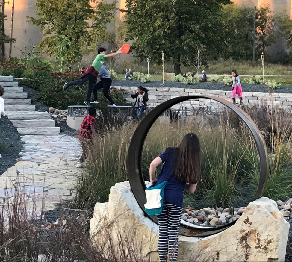 The district system also facilitated the creation of an artful stormwater park that provides pollinator habitat and that is used for passive recreation in the stormwater basin itself in between storm events. The stormwater park, completed in 2016, is open to the public at all times, and has facilitated an expansion of the public realm through the construction of the adjacent MPRB park (the newest MPRB park, temporarily named Towerside Park) in 2019. The stormwater park and MPRB park are visually seamlessly integrated, and the stormwater from the district system is treated by a filtration and UV system located in a new building within the MPRB park that also serves as a covered picnic pavilion and provides storage for the community garden. The treated stormwater provides irrigation for a pollinator-friendly “bee lawn” in the MPRB park as well as the community garden itself.