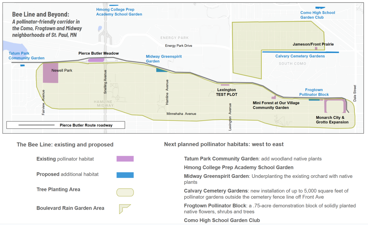 The Bee Line is a 2.25 mile corridor along Pierce Butler Route in the Como, Frogtown, and Midway neighborhoods of St. Paul that includes a series of gardens with native and pollinator-friendly plants. This all-native planting project is a neighborhood amenity, creates habitat for native insects and birds, provides stormwater infiltration opportunities, and serves as a model for low-intensity public right of way maintenance along publicly maintained roads.