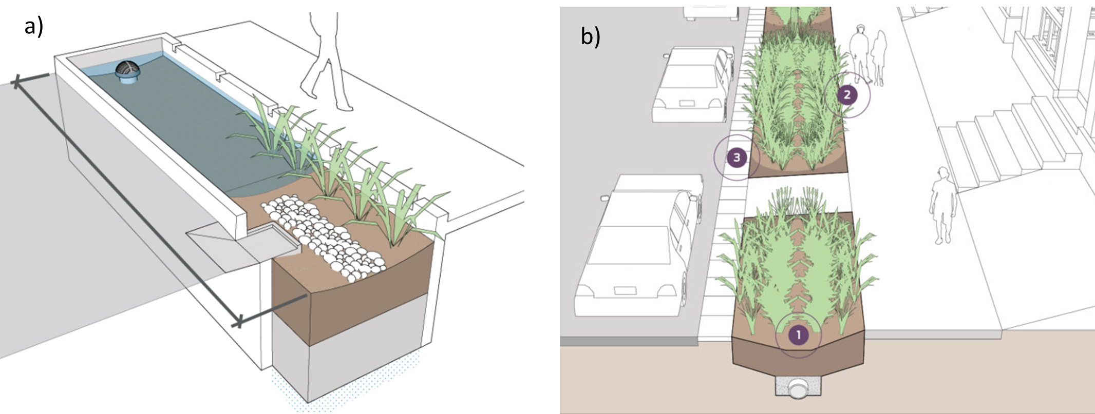 Historical and future projections of rainfall data can help determine how much bigger to make GSI. For example, if GSI are designed to retain the 90th percentile of rainfall, future rainfall projections may show that the 90th percentile of rain may be more in the future compared to twenty years ago. For GSI with limited area, as is common in urban landscapes, vertical walls provide greater surface storage capacity than graded edges (see Figure 2 ). Figure 7 a) Bioretention cell with vertical walls. (Source: NACTO, n.d. (1)) b) Bioretention cell with graded walls. (Source: adapted from NACTO, n.d. (2))